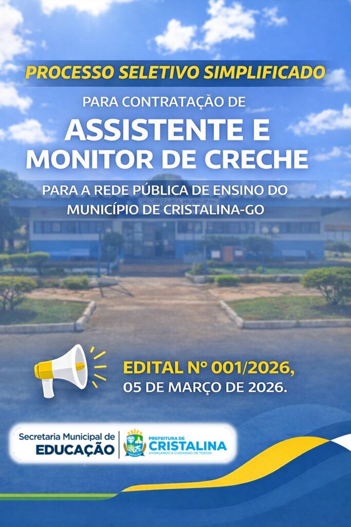 PROCESSO SELETIVO SIMPLIFICADO PARA CONTRATAÇÃO DE ASSISTENTE E MONITOR DE CRECHE PARA A REDE PÚBLICA DE ENSINO DO MUNICÍPIO DE CRISTALINA-GO EDITAL Nº 001/2026, 05 DE MARÇO DE 2026